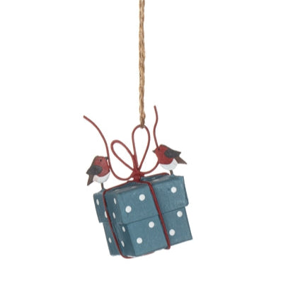 This jolly hanging decoration features a playful robin tying a colourful parcel, perfect for adding a touch of quirkiness to your Christmas display. Spread some cheer with this unique piece!