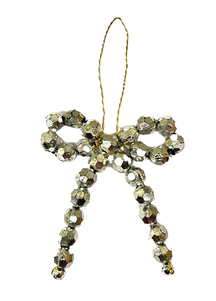 This festive decoration features shimmering silver beads crafted into a charming bow, perfect for brightening your Christmas tree or festive displays. Lightweight and easy to hang, it brings playful elegance to any space, making your celebrations even more magical.