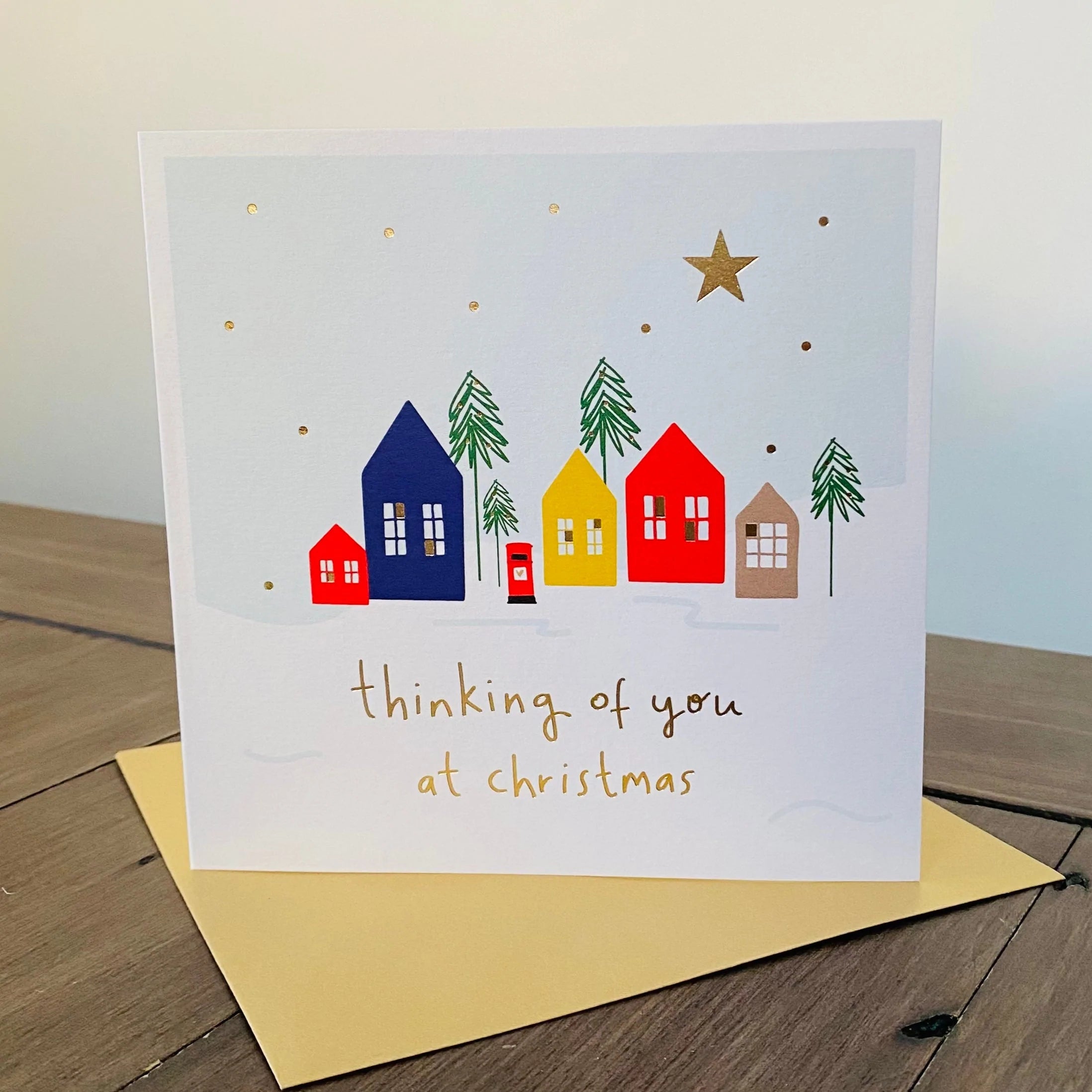 A contemporary Christmas card from Megan Claire, designed and printed in the UK, with gold foil debossing. Matched with a festive gold envelope.