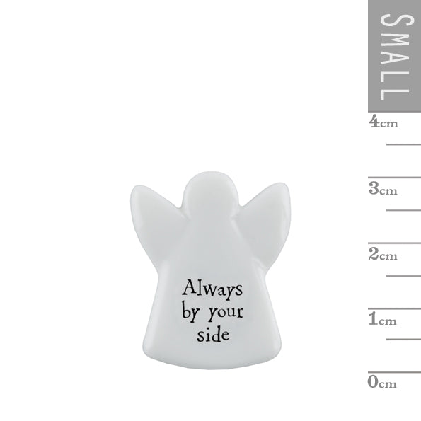 This East of India white porcelain token features a tiny angel and the heartfelt message "Always by your side."