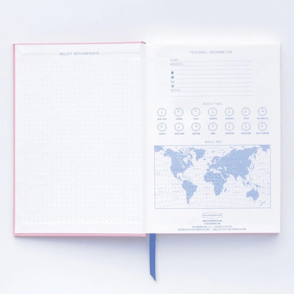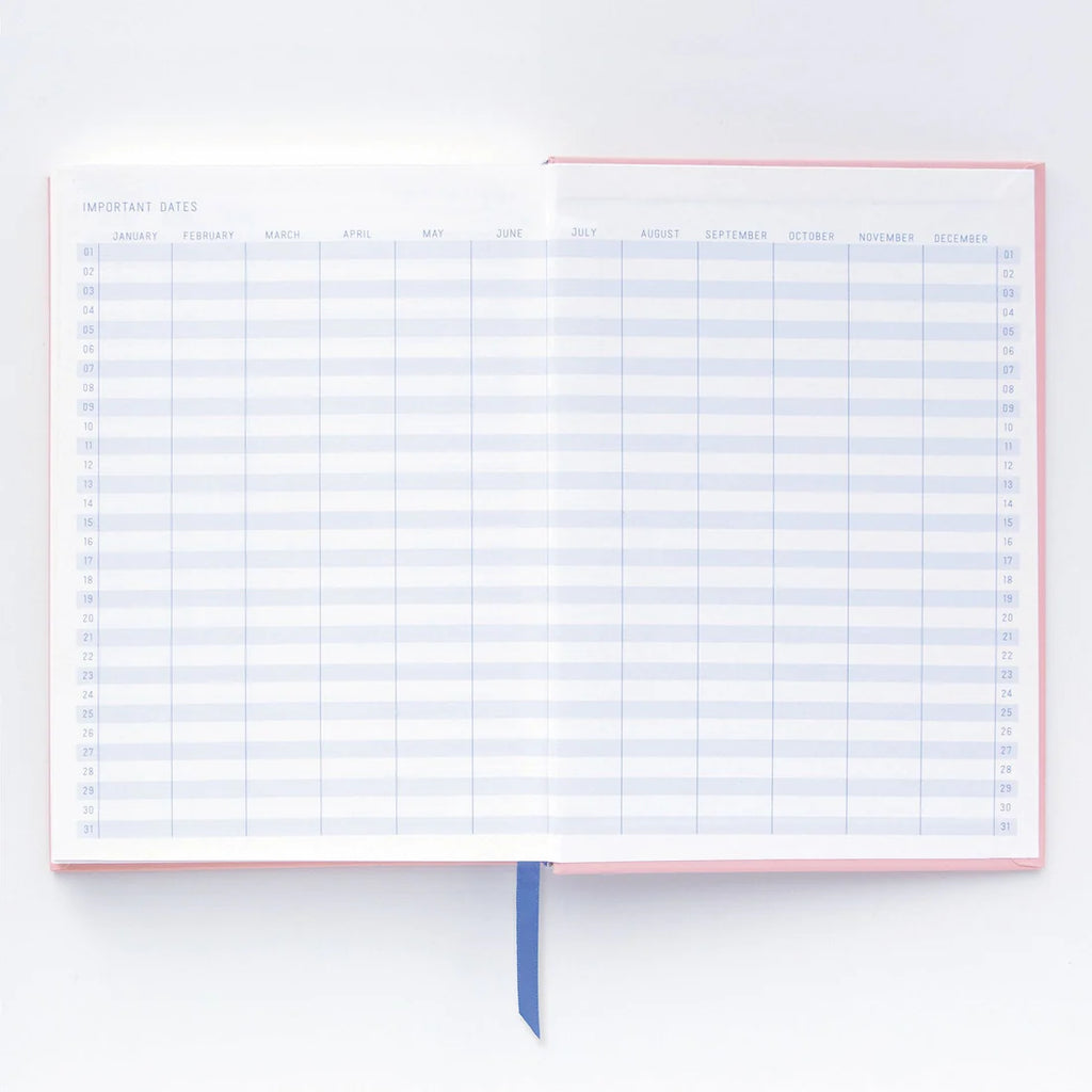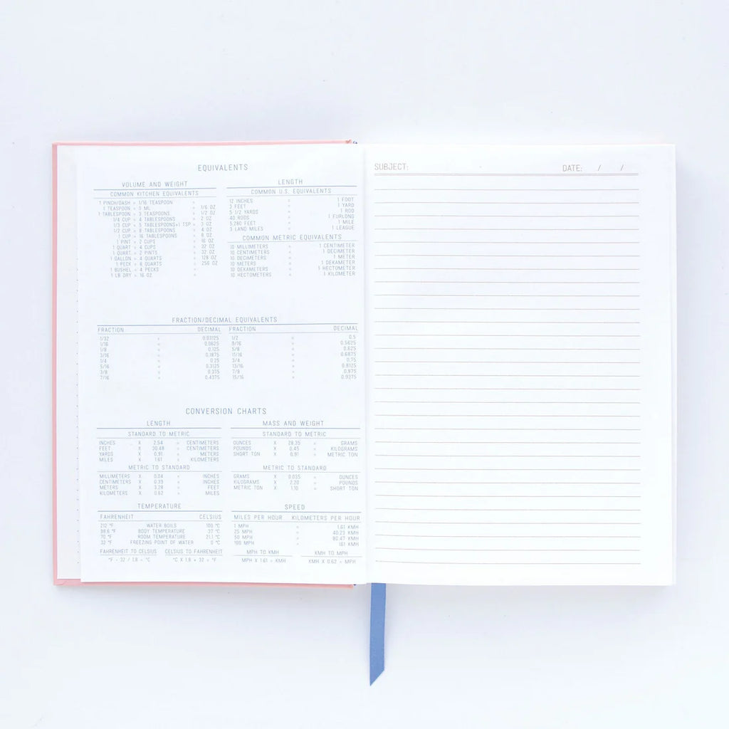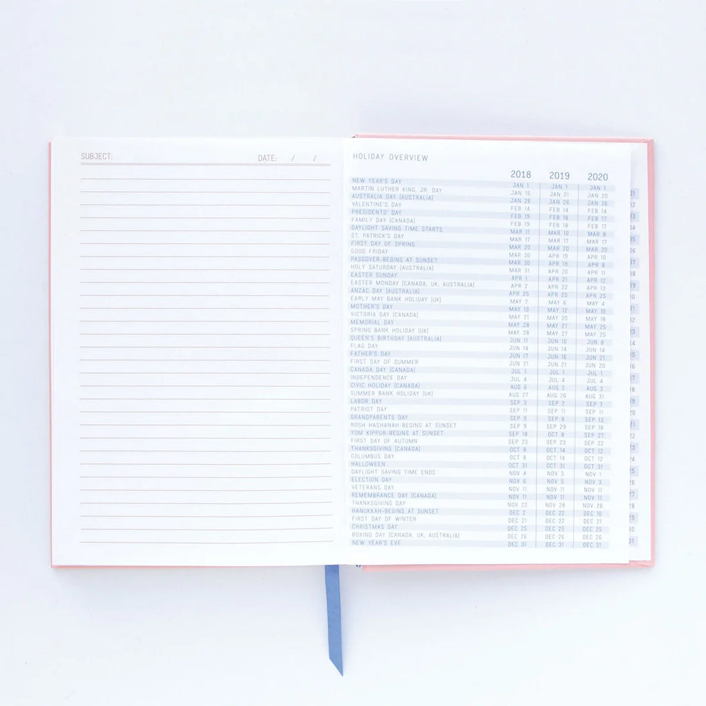 High-quality notebook features a soft touch, hard cover, a ribbon marker and handy references: World map, time zones, equivalents, multiplication table, holiday overview, important dates and space for personal information.