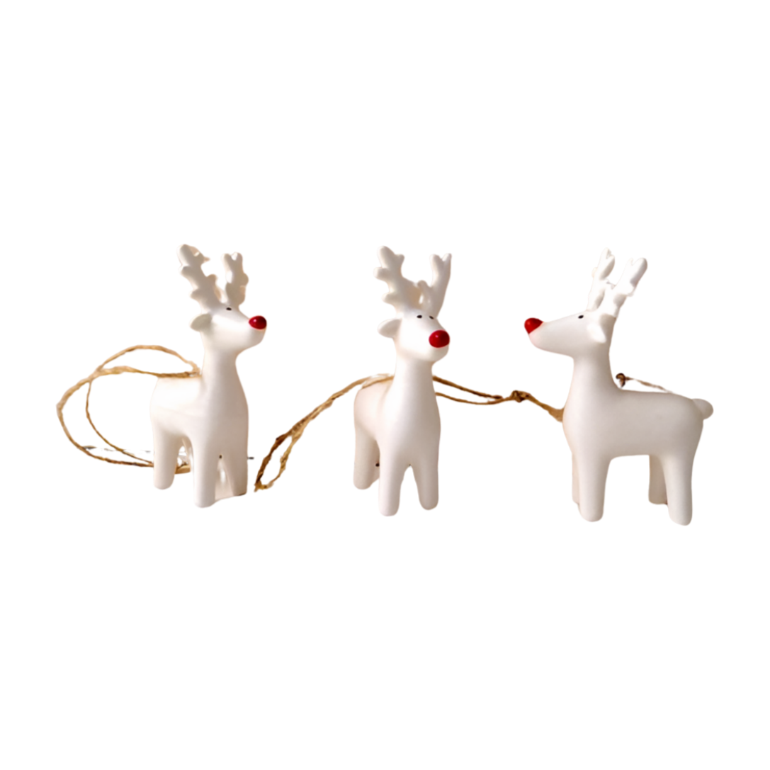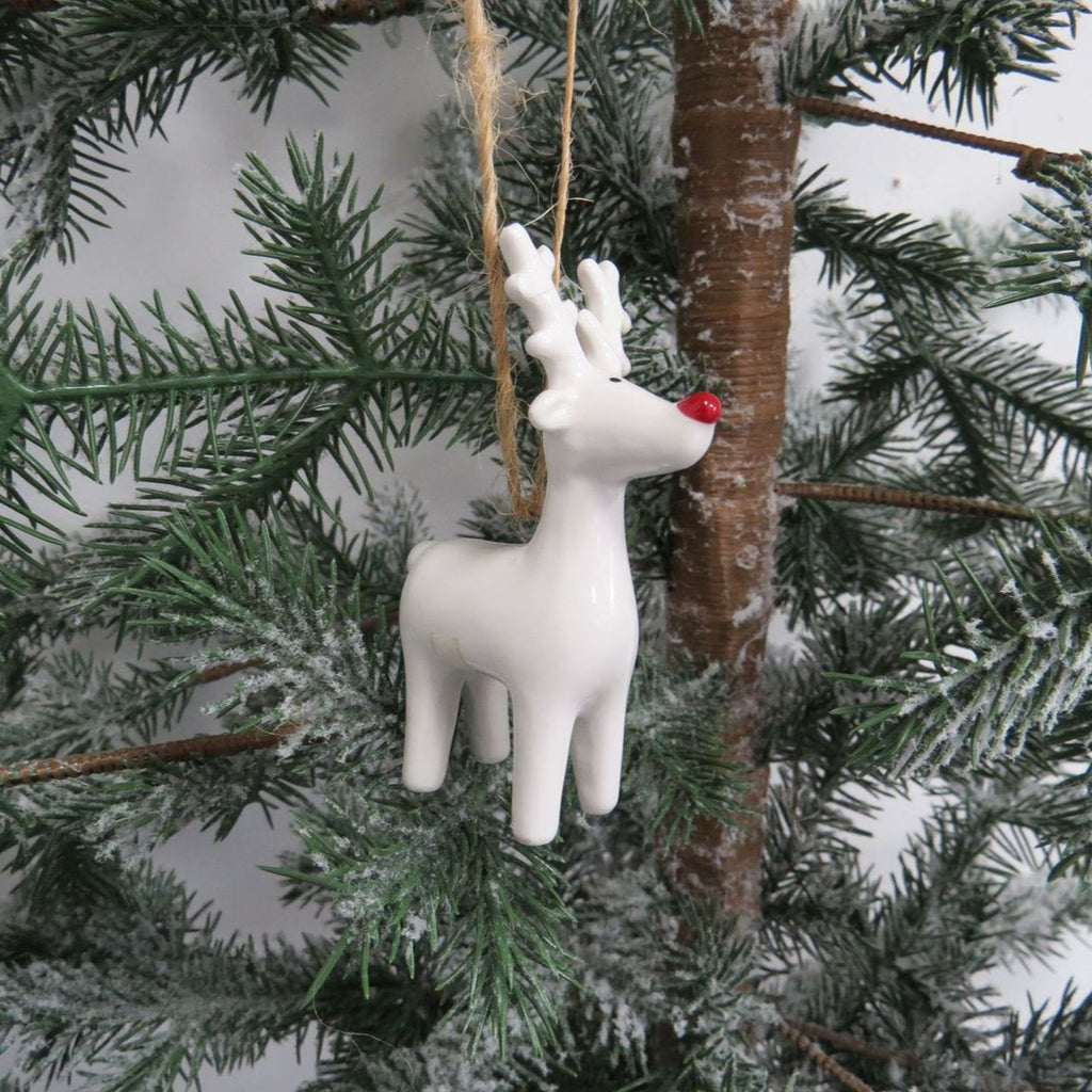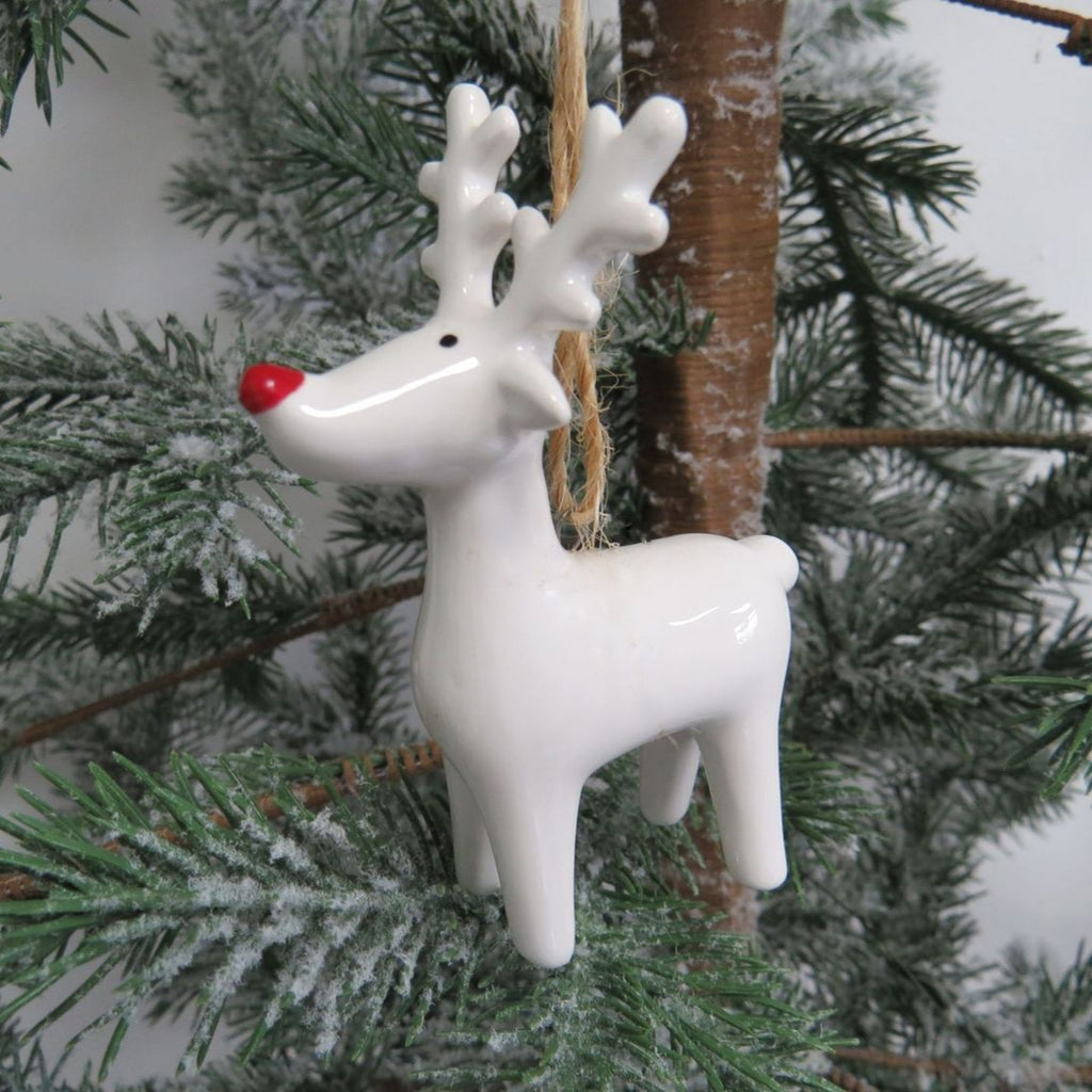 Add a touch of festive fun with this cute white ceramic reindeer hanging tree decoration.